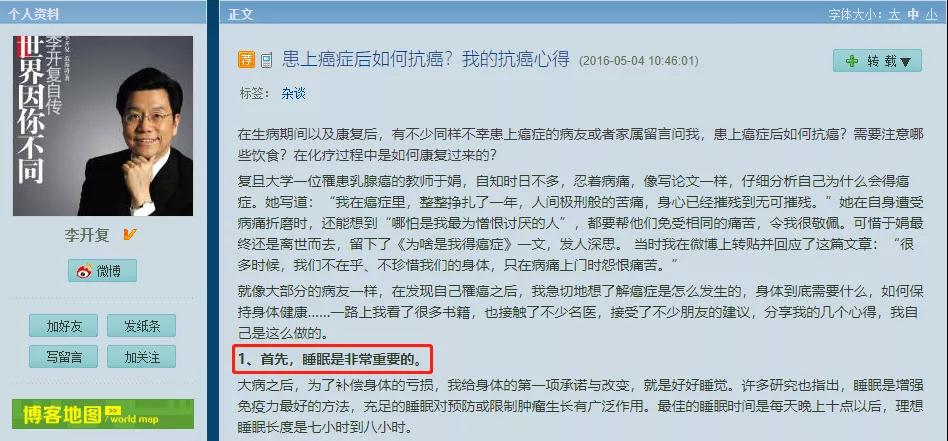 所有的人听到这个消息,都为他感到遗憾不已——一个成功的企业家,就这样被疾病打败了。可有句话说:得病的人,三分靠治愈,七分靠自愈。谁也没有想到,睡眠这件“小事”给了他致命一击,可同样也是睡眠这件“小事”,给予了他第二次生命。生病后,李开复开始调整自己的睡眠习惯,不再为公司的事彻夜难眠,即便因病痛难以入睡,也会安慰自己慢慢调整,直到自己睡着。2015年,李开复通过微博和网友分享消息,透露身体已康复。后来,他还专门写了一篇文章,呼吁大家重视睡眠。