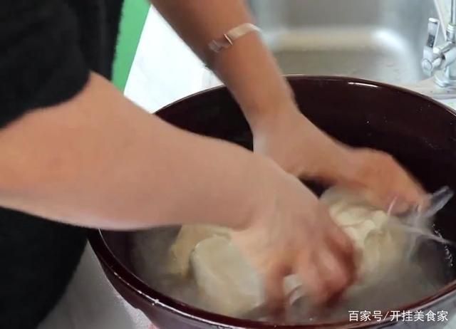 一些放盆里准备装面巾。这个盆里就是刚才洗面精洗出来的面水。现在让他进去。是沉淀三个小时左右,锅里水烧开后直接放上去蒸,纯手工面筋,不需要认可的东西,大火蒸20分钟左右就可以了。就会面筋蒸熟了,把面筋拿出来晾凉,然后直接用手撕成小块装盘里备用。自己在家蒸的面筋,没有任何的添加剂,就会做到蓬松、有蜂窝。这样的面筋吃着才更加的好吃。