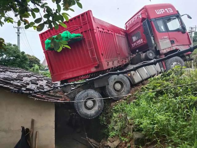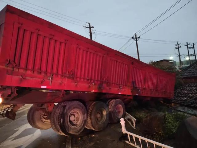 据货车驾驶员回忆,由于当时下雨,事故发生地路面不平,有积水,车辆开始侧滑,一脚刹车下去之后,大货车车头转了180度的圈,车身撞上了右侧护栏和民房屋檐,才停了下来。实在惊险,现在想起都有点后怕。