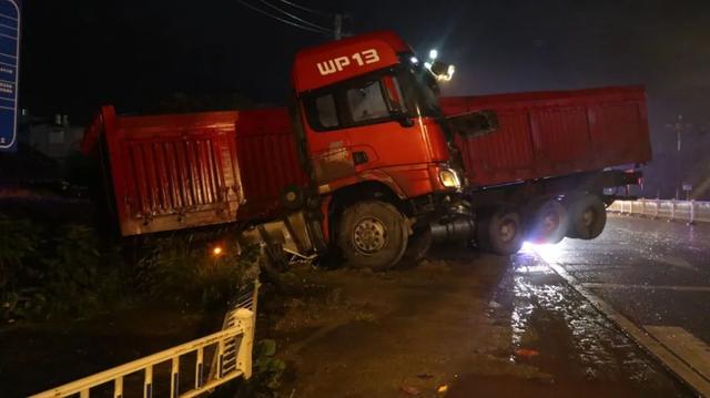 当时是凌晨3时31分许,报警人称,学府路大济镇往榜头方向,一辆大货车突然失控侧滑,撞上了护栏和路边民房。