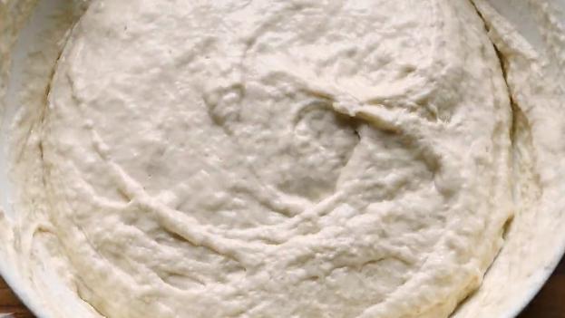2、将面团混合后,盖上盖子或保鲜膜,横向放开15分钟。时间到了,加入一半清水,再用筷子搅拌均匀,搅拌到浆细面团消失,可以做成凉皮。