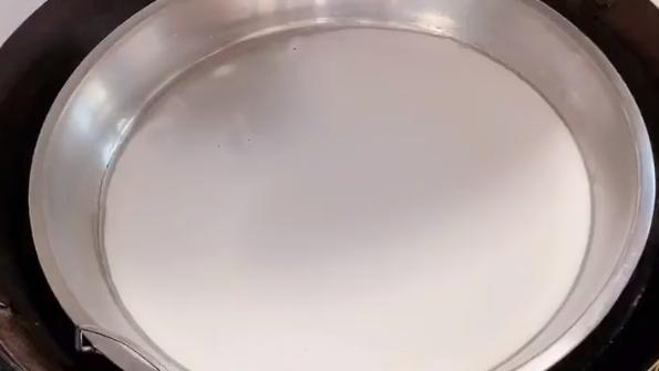 3、往锅里放水,开大火烧水。准备平底盘,涂上薄油后,放入1-2杯面糊,左右摇动盘子,将面糊均匀地摊在盘子上,然后放入水蒸2-3分钟,面糊开始大泡时取出,在冷水中快速冷却后,1片凉皮就做好了。