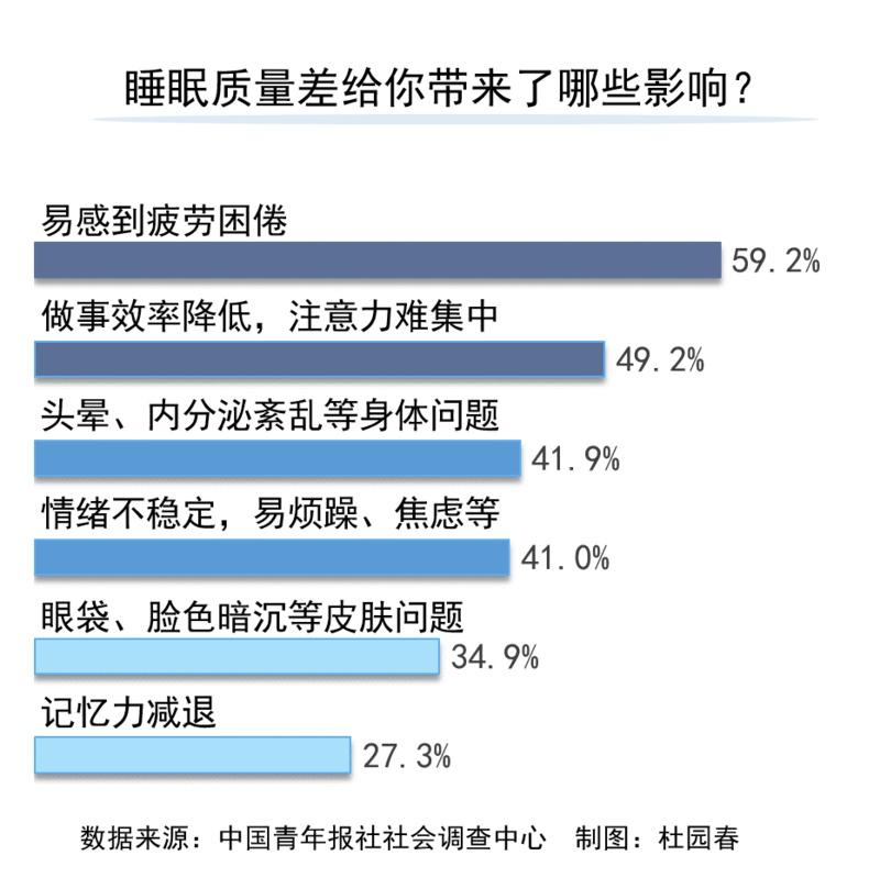 睡眠质量差带来哪些影响?59.2%的受访青年坦言易感到疲劳困倦,49.2%的受访青年做事效率降低,注意力难集中,41.9%的受访青年存在头晕、内分泌紊乱等身体问题。其他还有:情绪不稳定,易烦躁、焦虑等(41.0%),眼袋、脸色暗沉等皮肤问题(34.9%),记忆力减退(27.3%),脱发加重(22.9%)。